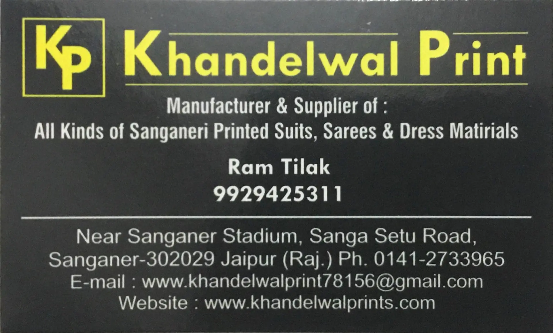 I have placed order with Khandelwal print twice. The first experience was very nice. I received very good quality things and delivery was prompt. However, I wasn't so lucky second time. I had placed order for some kota sarees. What I received was a few pieces of substandard 3 mtr long cloth. How can anyone call them sarees? On contacting, the person who was my contact person refused to either refund my money or to take the sarees back. " Things once sold are sold" was his point black reply. When I tried calling up the number given on the net, I got even bad experience. The moment I introduced myself, the phone was hung on my phone and then I got the message that their phone is switched off. What kind of cheating business are you guys doing? We send you money in advance. You should at least honour our trust. Very very unethical and unprofessional behaviour. Shame on you. You don't even have the courtesy to apologize and take responsibility.