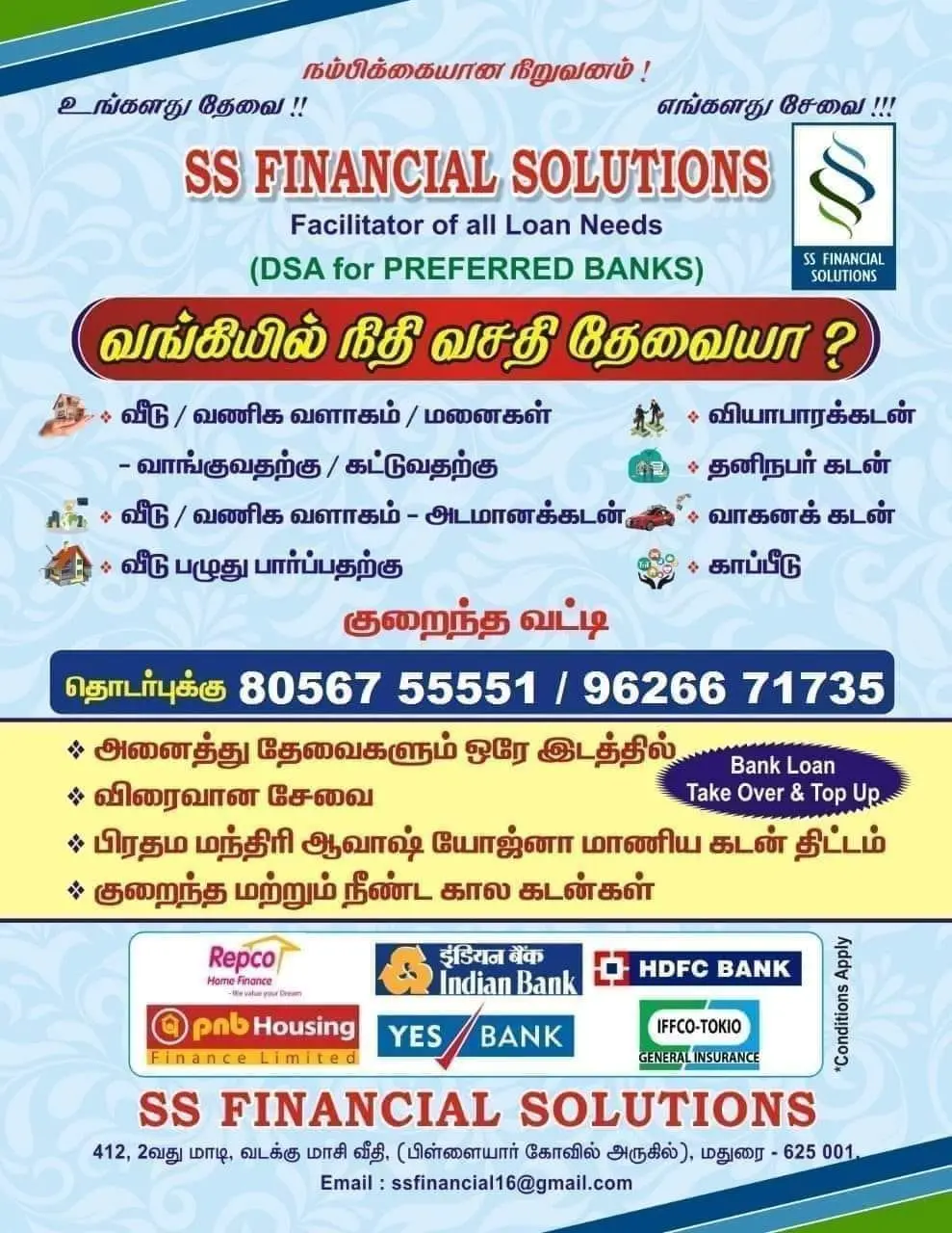 SS FINANCIAL SOLUTIONS specializes in loan providers for customers in Madurai.
